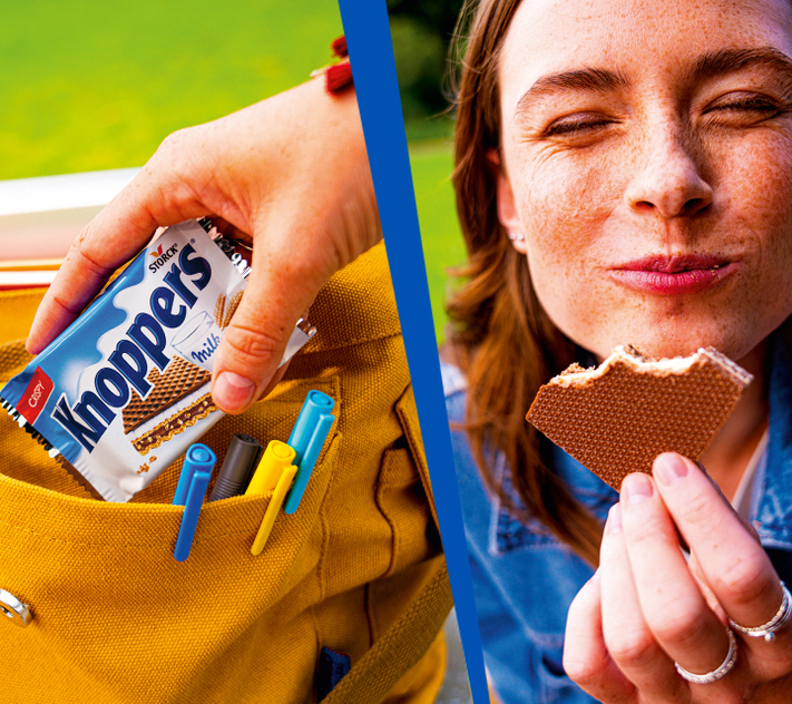Depuis le lancement de Knoppers en Suisse en 1989, notre en-cas craquant au lait et aux noisettes a battu des records de vente. Au travail ou sur la route, rien de tel qu’une pause détente avec un délicieux Knoppers: cette gaufrette croustillante, délicatement fourrée de lait et de crème de noisettes fondante, rehaussée de noisettes grillées croquantes, est le meilleur des en-cas gourmands!
