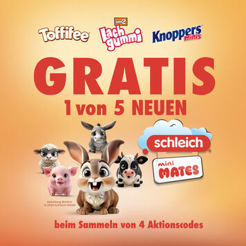 Jetzt 1 von 5 schleich® mini Mates gratis sichern - beim Sammeln von 4 Codes in Aktionspackungen von Toffifee, nimm2 Lachgummi und Knoppers Minis.